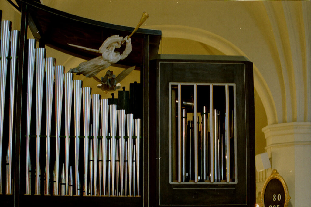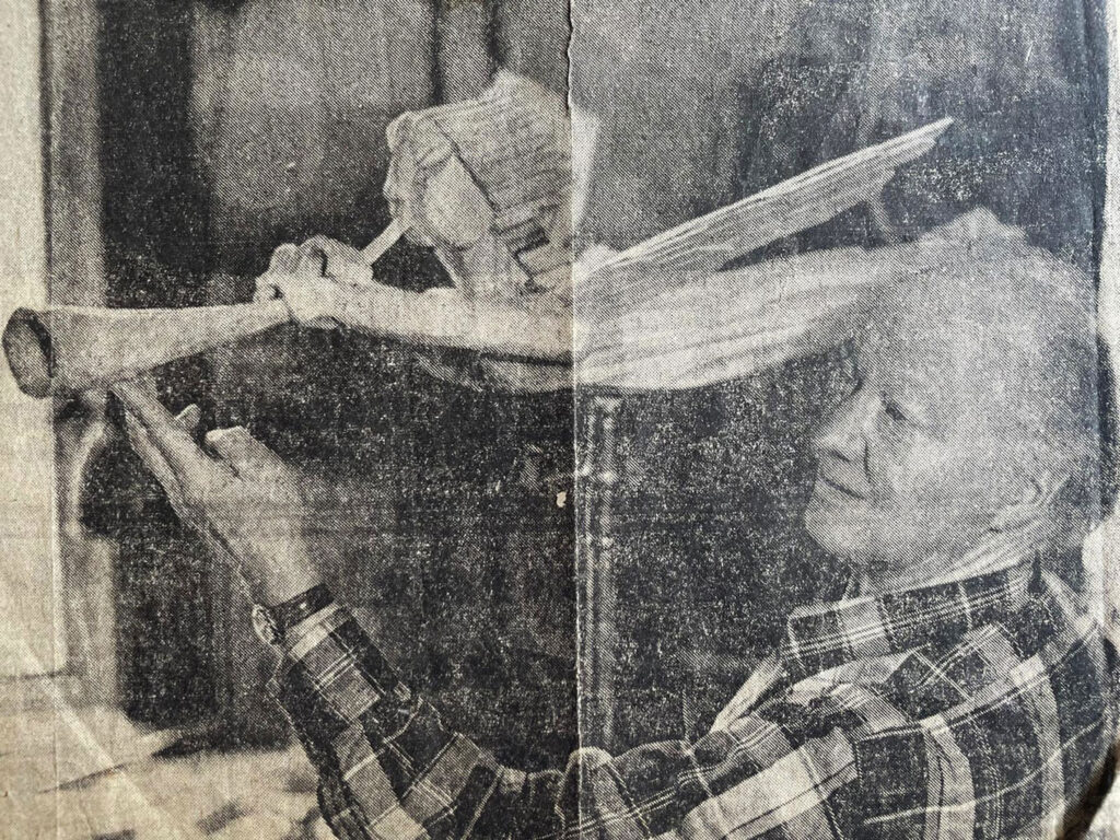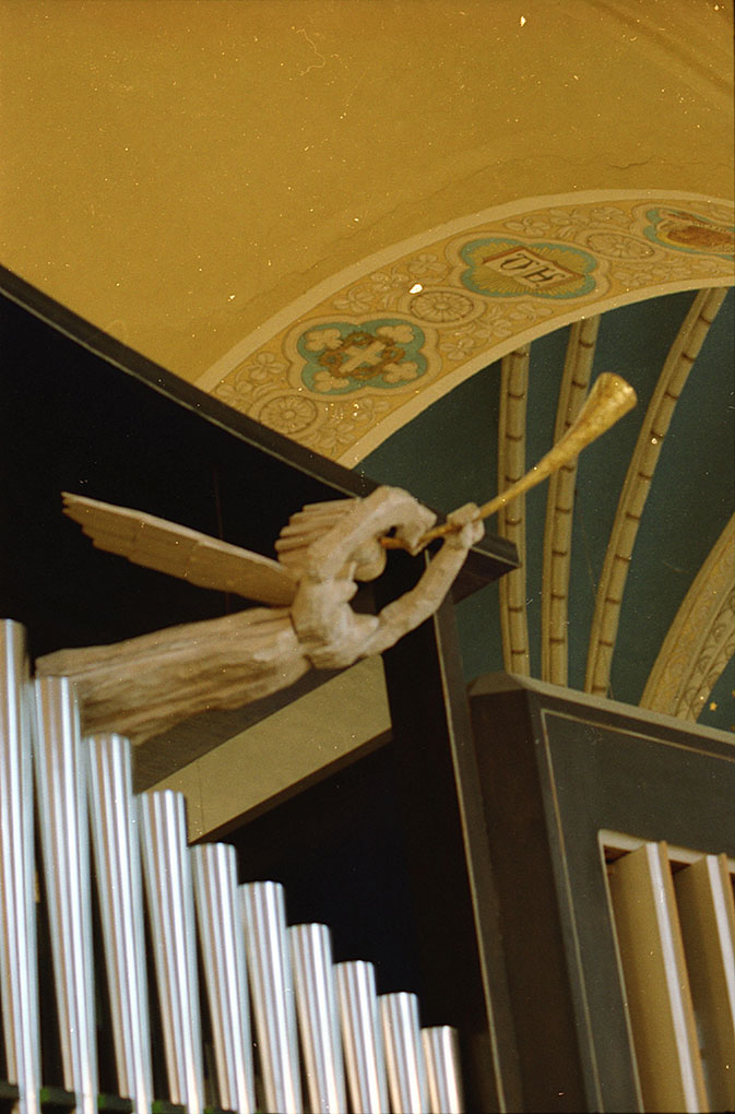 Folke carved a limewood trumpeting angel to decorate the organ. It is so nice that we have the photograph of Folke holding his carving.