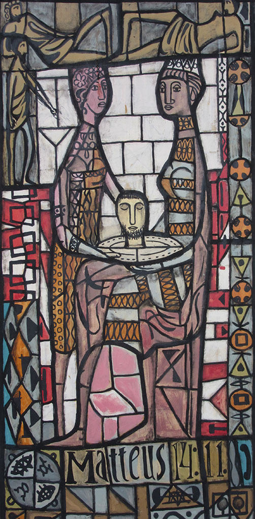 The head of John the Baptist is presented by Salome to Herodias, wife of Herod the Tetrarch. Herodias’ marriage to Herod had been damned as incestuous by The Baptist. When Herod promised Herodias any wish she wanted for allowing her daughter Salome to perform her ‘Dance of The Seven Veils’, Herodias demanded John’s head on a charger. Even though Herod could not find any capital offence by John he was obliged to the task because of his oath. (St. Matthew, Chapter 14, verses 1–15.)