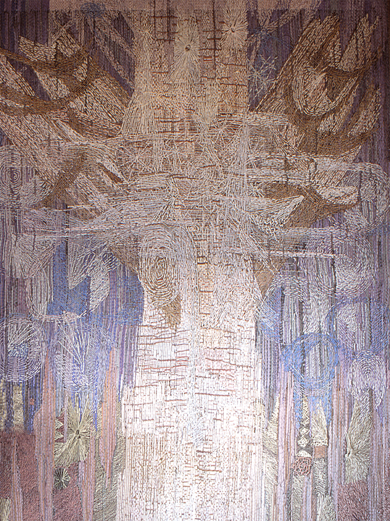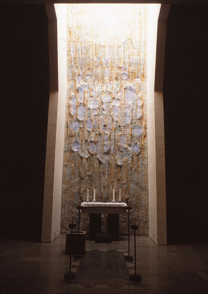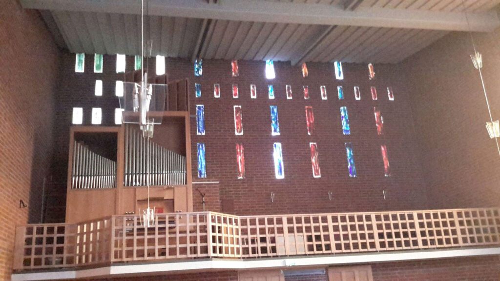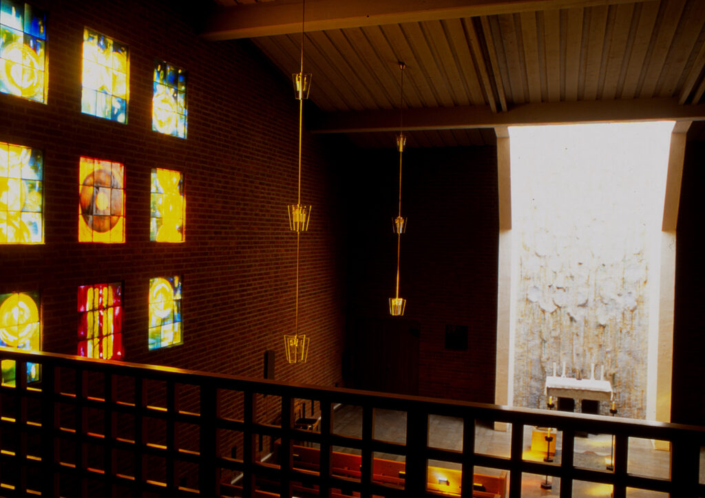 For the smaller of the two chapels, St. Steffan’s, Folke made a wonderful “Sunburst” roundel of painted glass, about 1.5m in diameter, using brilliant yellows and blues and very bold overlapping of colours to catch the afternoon sun. His daughter Meike made the large ‘Tree of Life’ tapestry that hangs on the wall, using natural fibres and natural dyes. In the larger St. Erik’s Chapel, on the south wall he placed a block of nine square windows, the outer seven indicate the changing positions of the sun, while the two central lower ones indicate the fiery sun’s central core. More light came from the nine 3m high slit windows in the organ loft, using thick glass of many colours.
