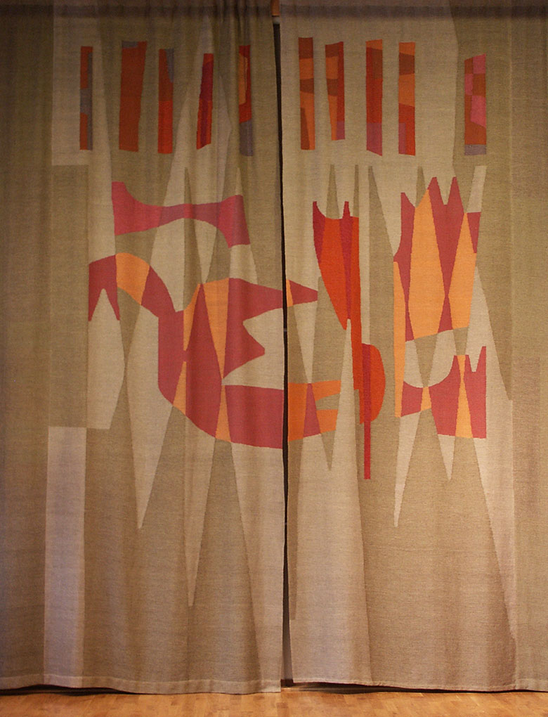 Folke designed stage curtains for the large 260 seat room on the first floor, these are 400 x 500cms and were woven at Alice Lund Textilier.