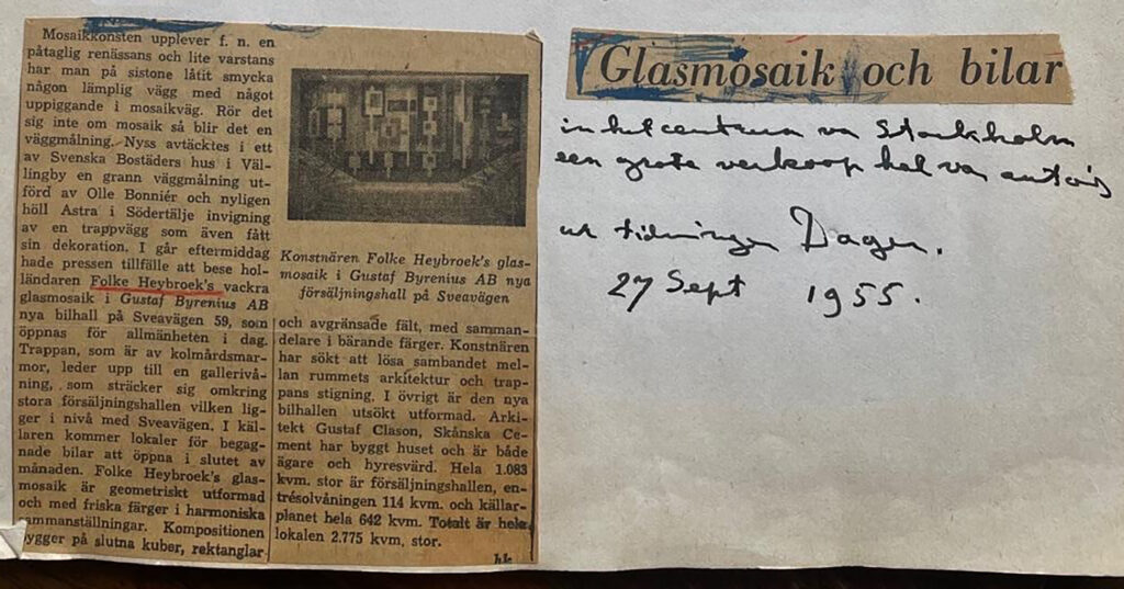 Folke made a large glass mosaic as the focal point for the entrance of this new car showroom in Stockholm. The photograph from Folke’s Diary is at present the only record we have of it.