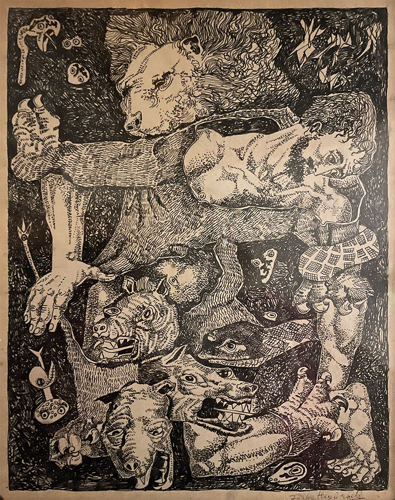 Folke was approached by Gebers Publishers, Stockholm, and asked to make 20 pen and ink drawings depicting scenes from the Greek Myths. The drawings show the violent passions of the Gods unleashed on fickle man. Folke was paid for his work, however at the last minute the book was not published, he retained the drawings and they were shown at exhibitions in later years.