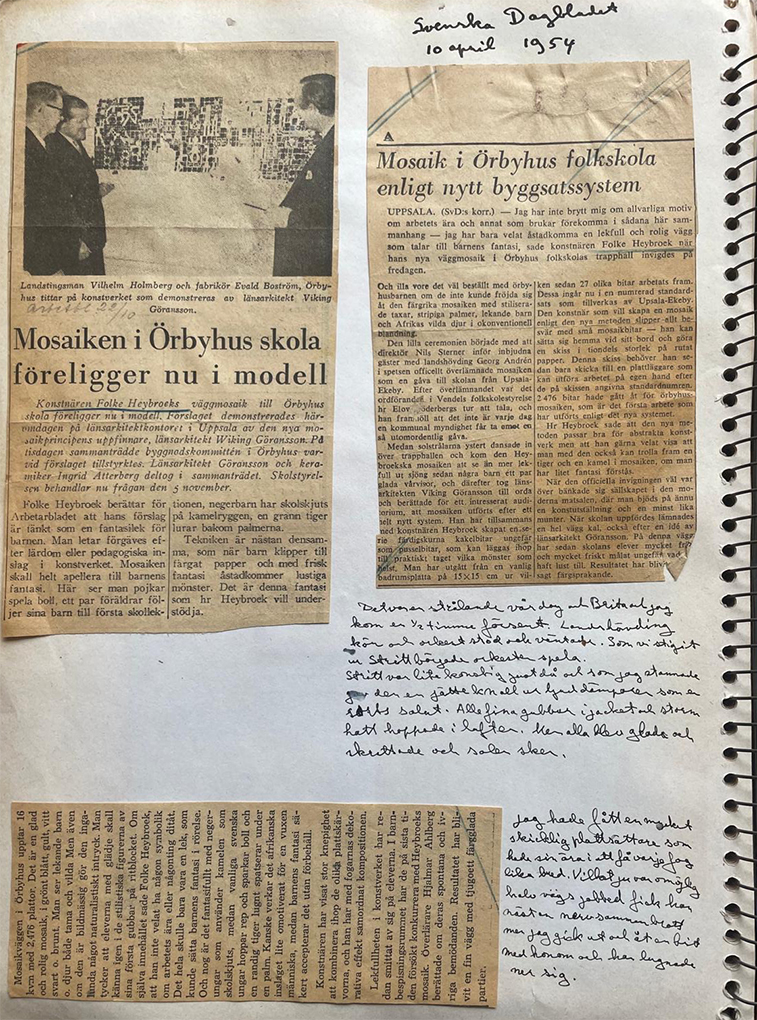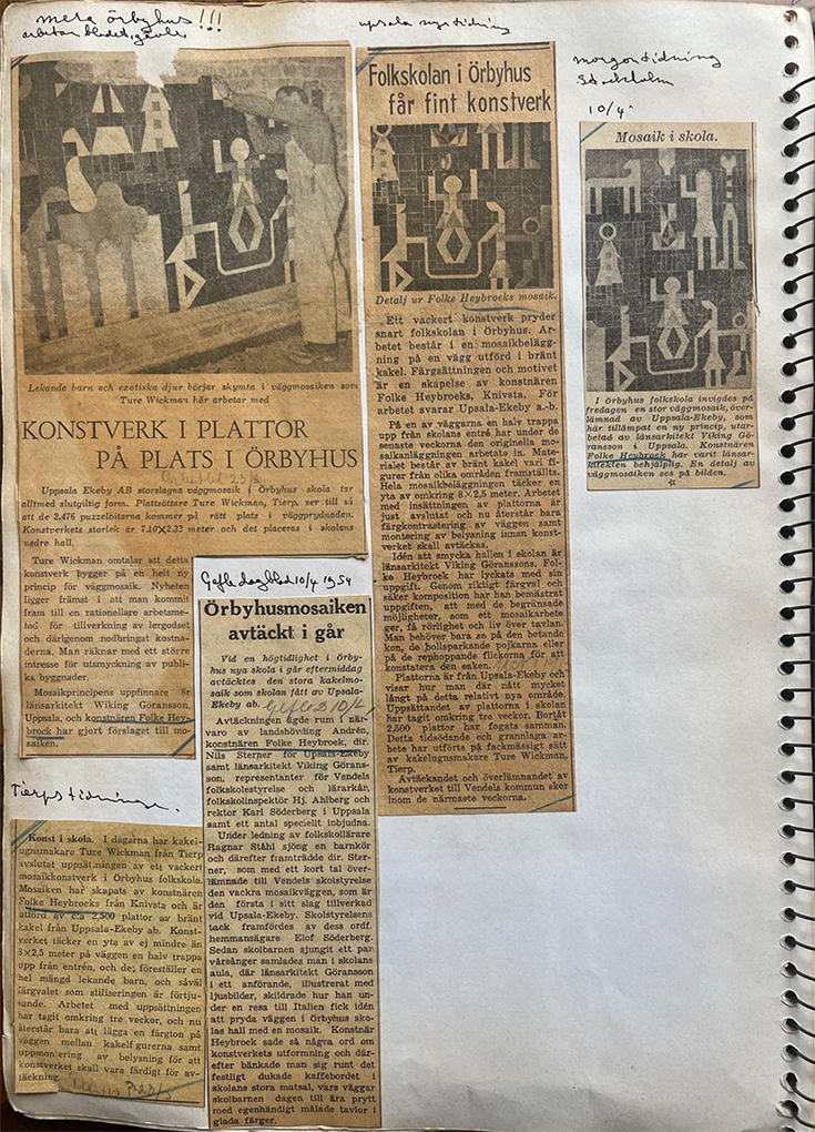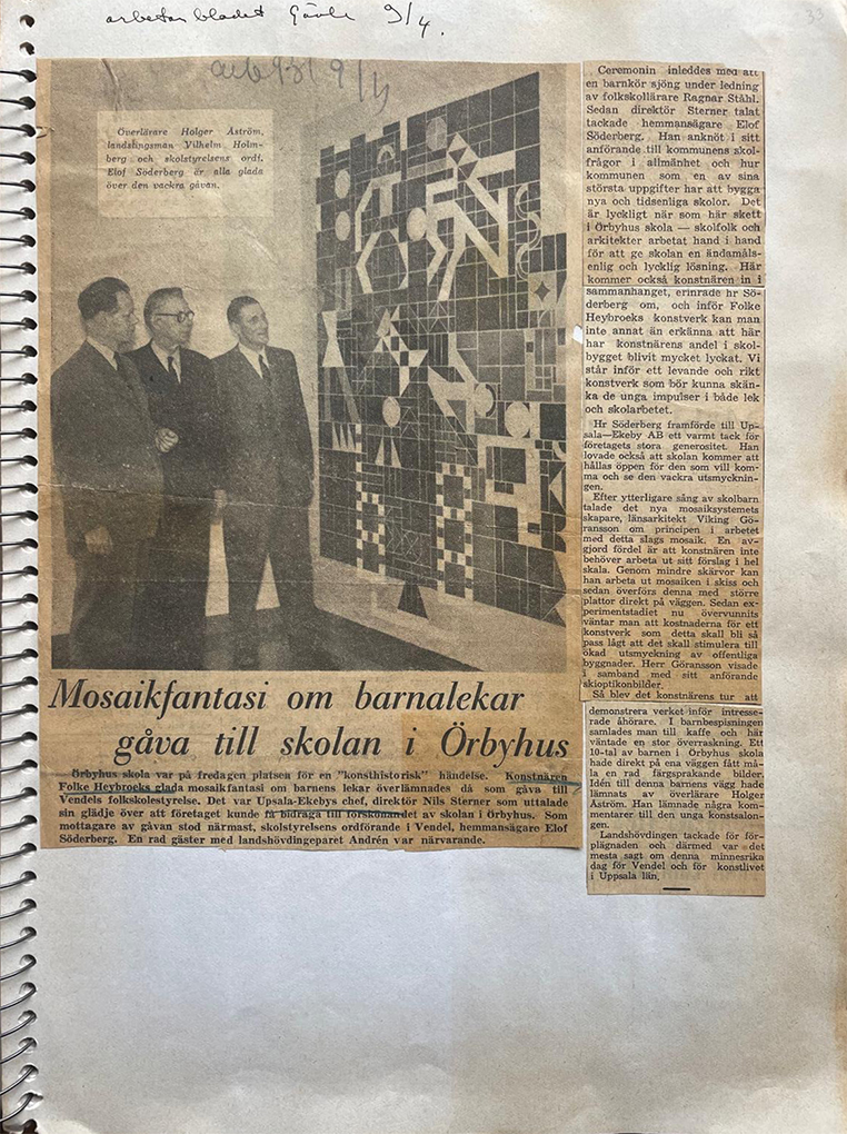 An astonishing and original design for 1954, Folke used locally made tiles, supplied free, cut and mounted to make this playful and dramatic wall in the entrance hall of a new school. Although the budget was modest, Folke produced this large, colourful and bold work to lift the imagination of the young students.