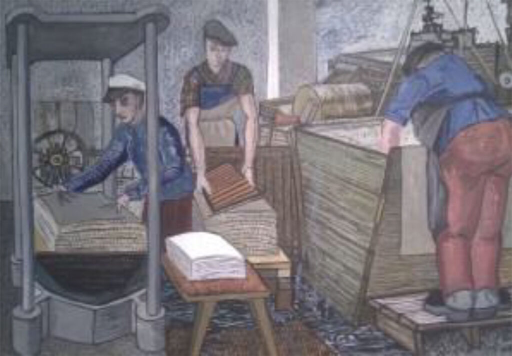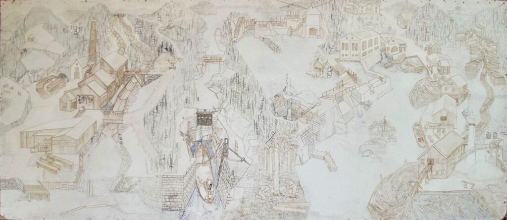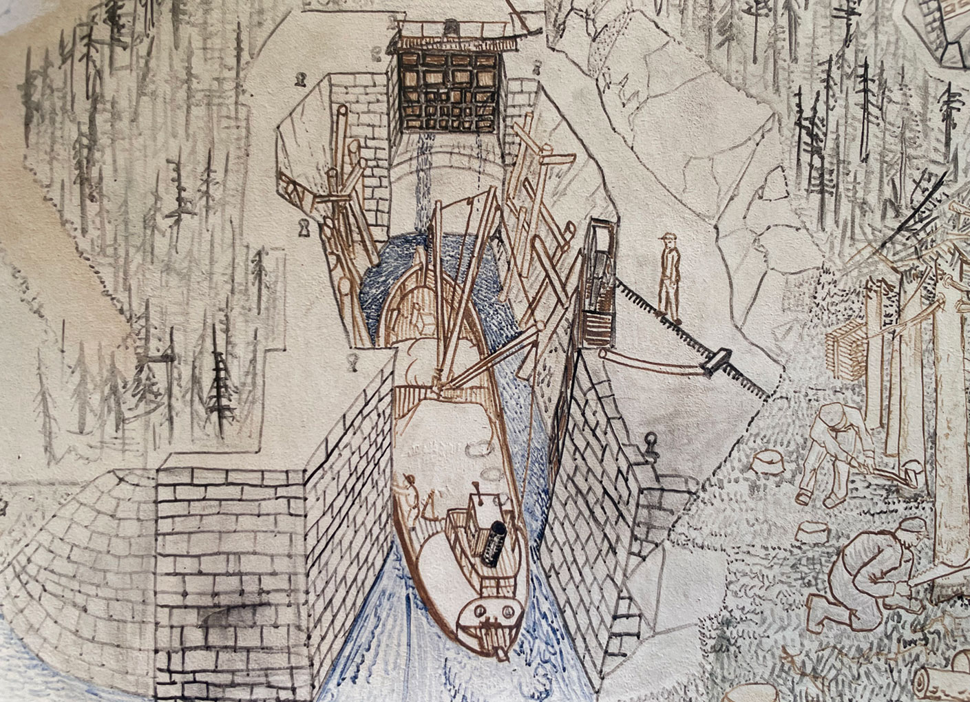 The lock gates are portrayed in the middle, with the Han pulp mill to the left. The picture shows how the timber is processed from tree logs to timber, pulp and paper.