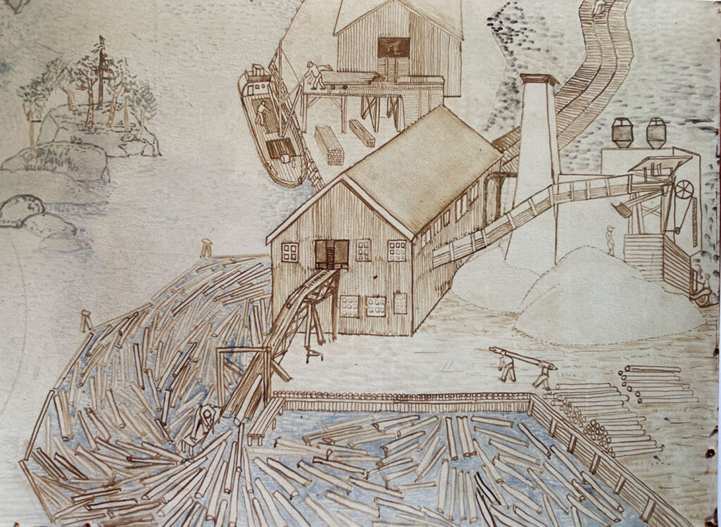 This panoramic view of the complete Töckfors Mill tells the story of all that is going on in the enterprise. It shows amazing detail including, for example, every single board on the ship’s deck, loading timber.