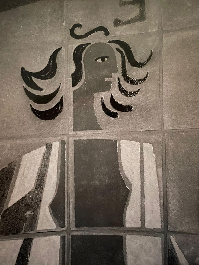 With commanding views of the city on one side, Folke made a ceramic tile wall for the other. He describes how he wanted to “create a special feeling of friendly and pleasurable lightness, of summer breezes through the trees, a pastoral idyll of bathing, and dreams of holidays”.